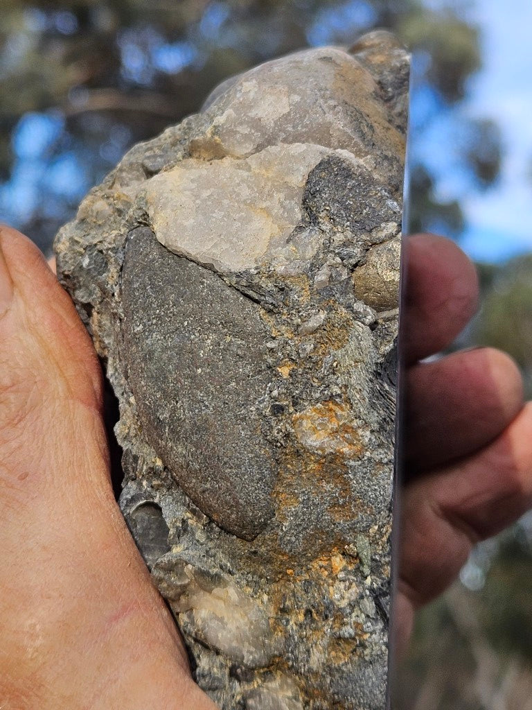 Coarse and fine gold is seemingly related to higher concentrations of pyrite within a 200 metre sequence of poorly-stratified, poorly-sorted, polymictic, pebble-to-boulder ferruginous conglomerate.