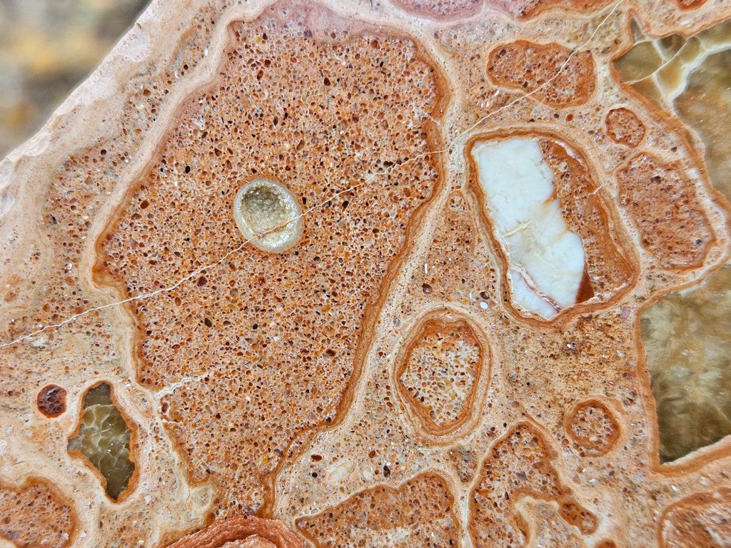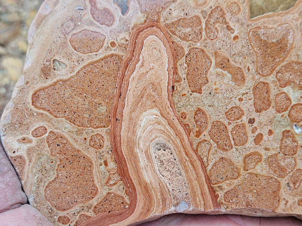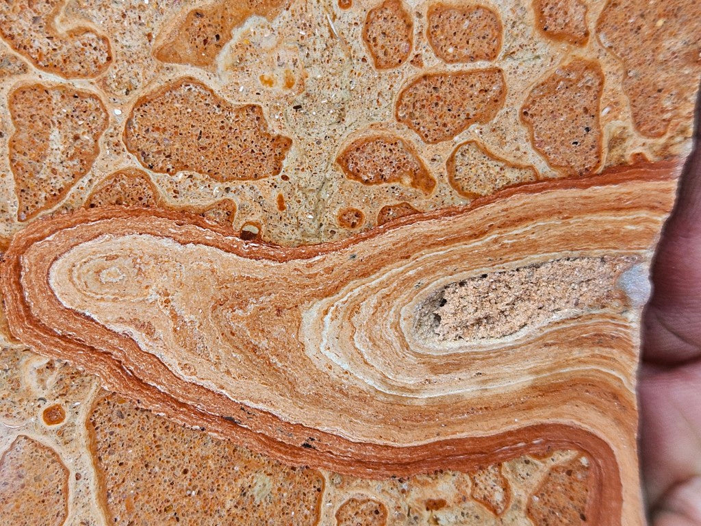 Oncolite is a limestone composed largely of oncoids—rounded, coated grains that grow as thin layers of lime mud accumulate around a tiny nucleus (such as a sand grain or shell fragment) under microbial influence. Formed in shallow, sunlit waters with gentle movement, oncolites often display attractive concentric or wavy banding and are classic indicators of ancient shoreline and lagoon environments.