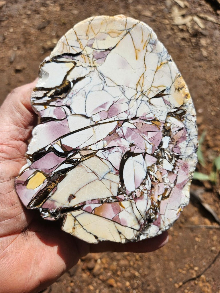 BM339 Brecciated Mookaite rock, cut and polished on one side with a natural rough back .