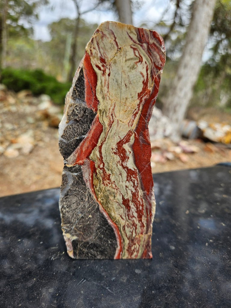 CJ103. Convoluted Jasper rough rock, cut and polished on one side with a natural back and a cut base to stand on.