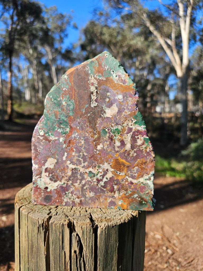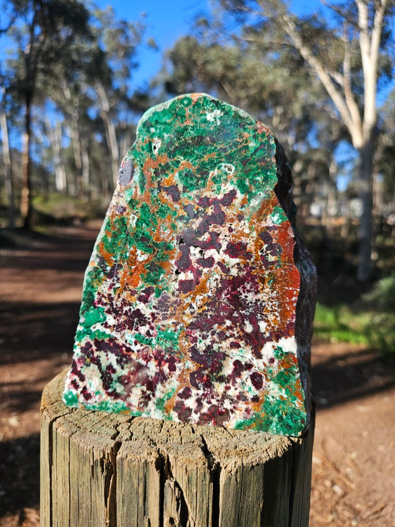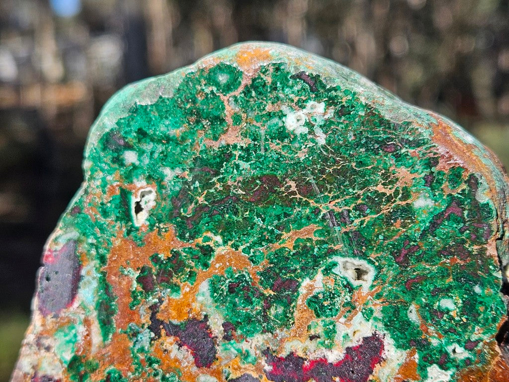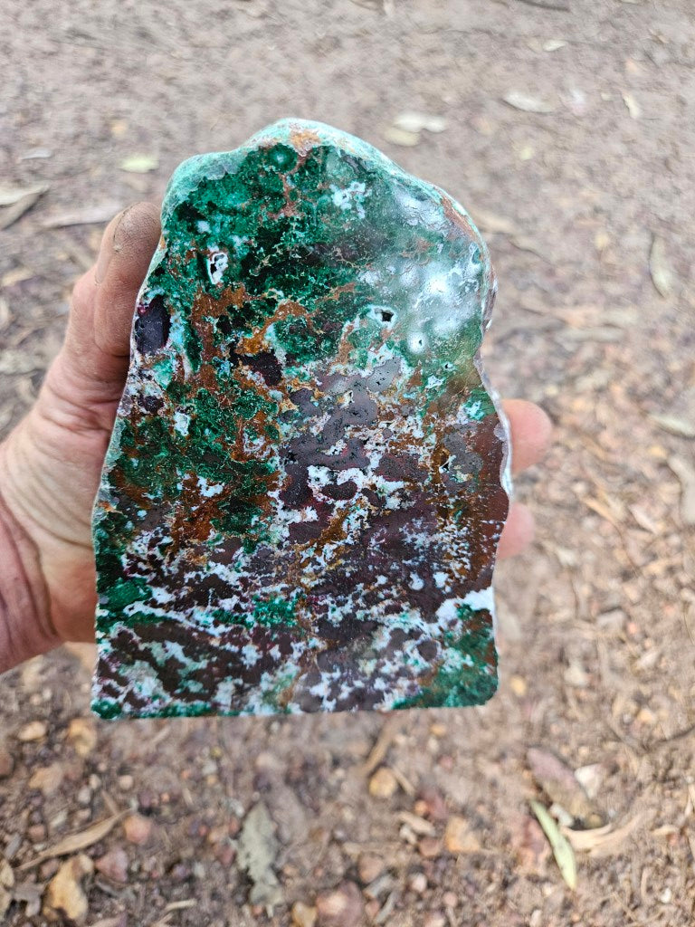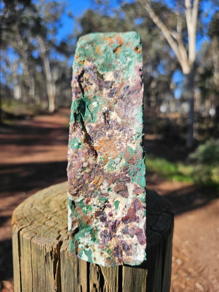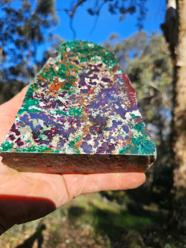 CO110 DeGrussa copper ore rough rock, cut and polished on one side with a cut back and cut base to sit on.