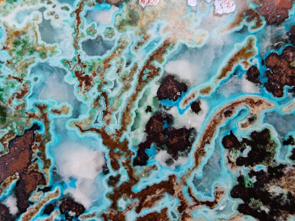 Consisting of dark green malachite, bright blue chrysocolla, native copper, tenorite, minor cuprite and brown iron oxides.