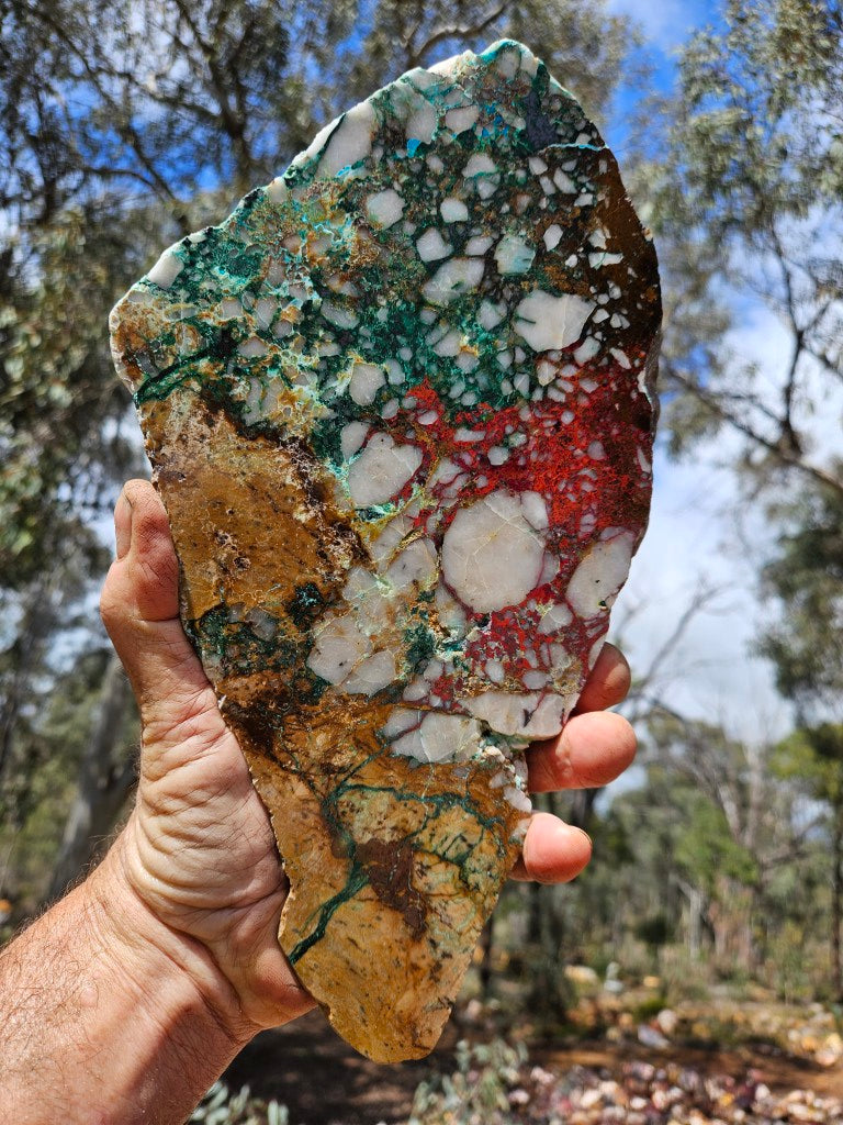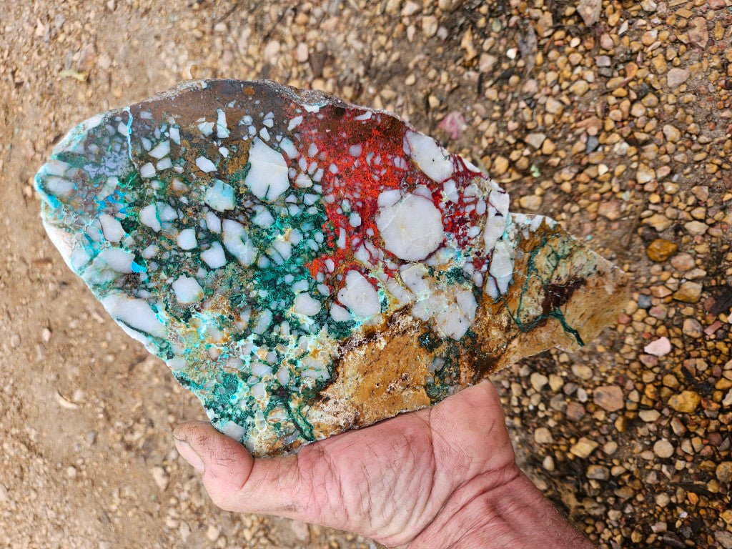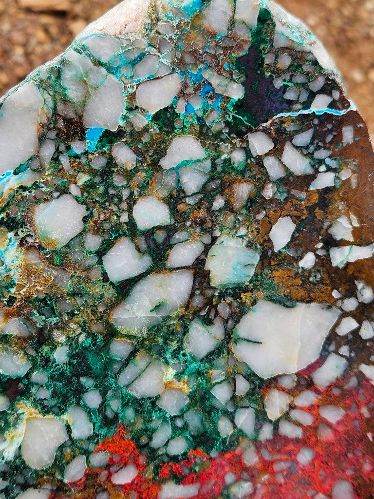 Consisting of dark green malachite, bright blue chrysocolla, native copper, tenorite, minor cuprite and brown iron oxides. All running through brecciated white quartz !