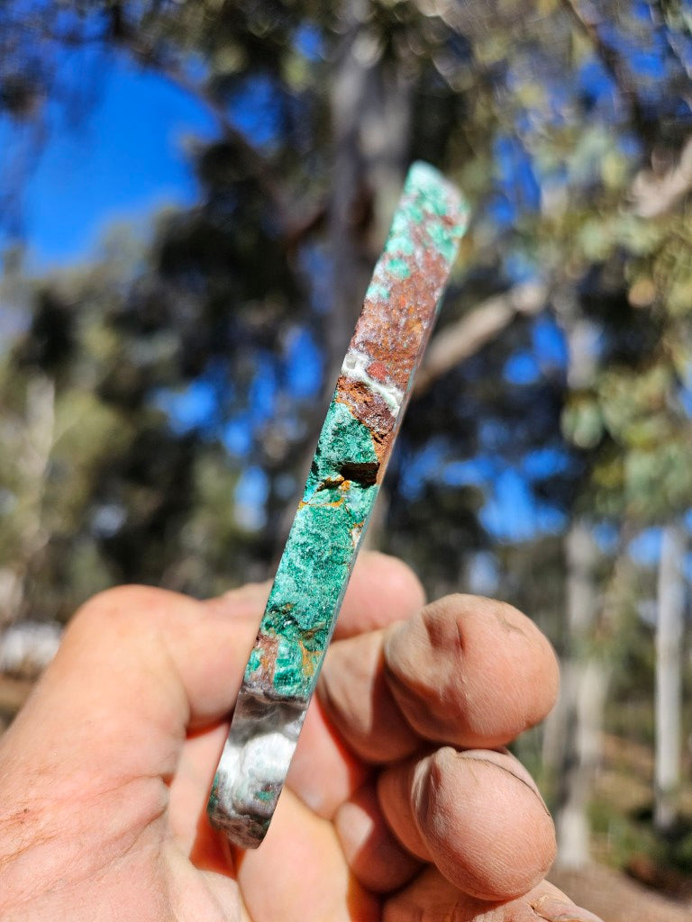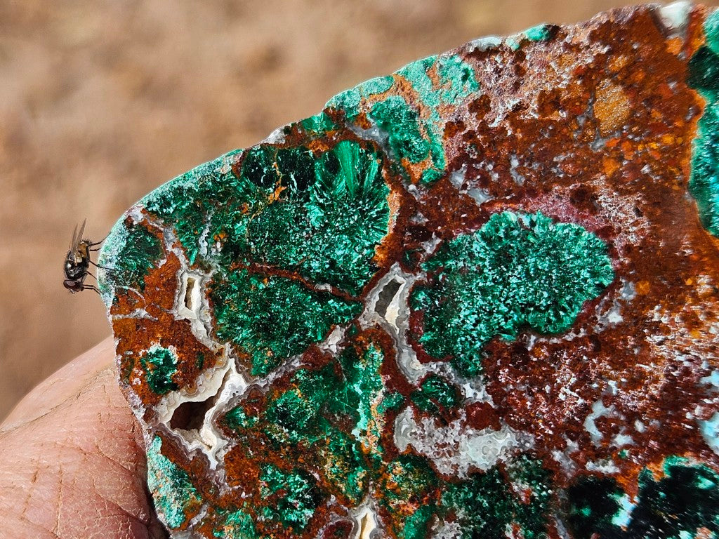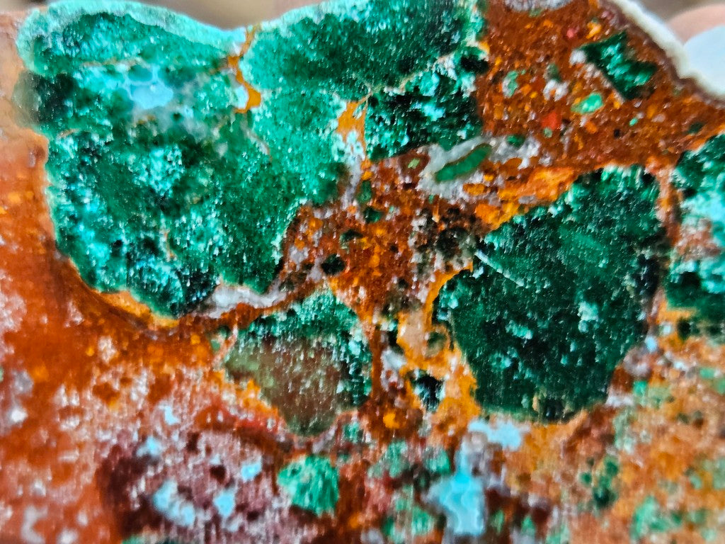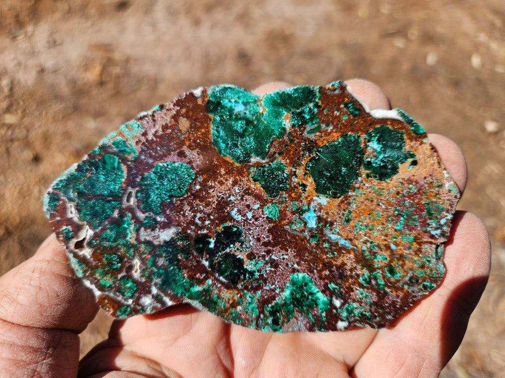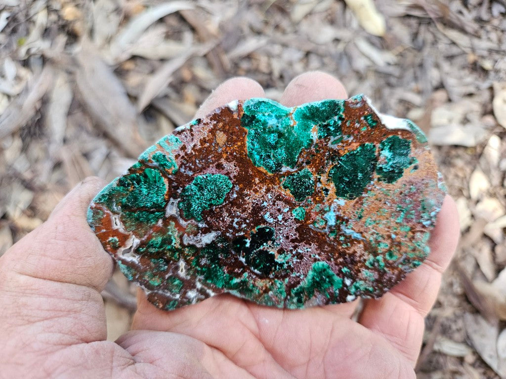 Consisting of dark green malachite, tenorite, minor cuprite and brown iron oxides.