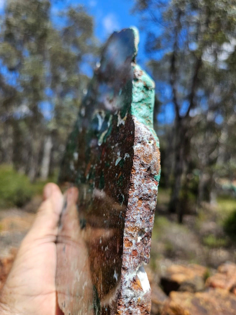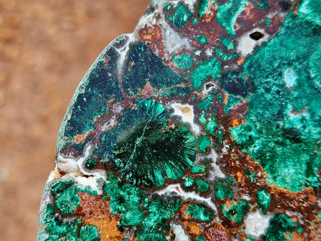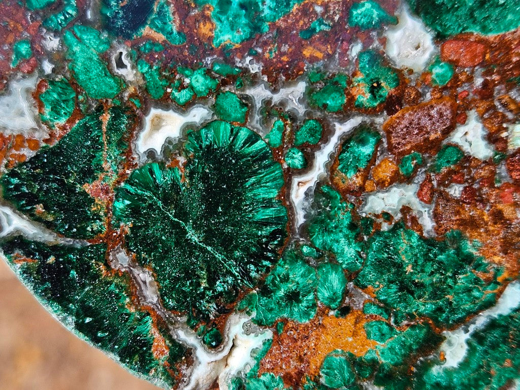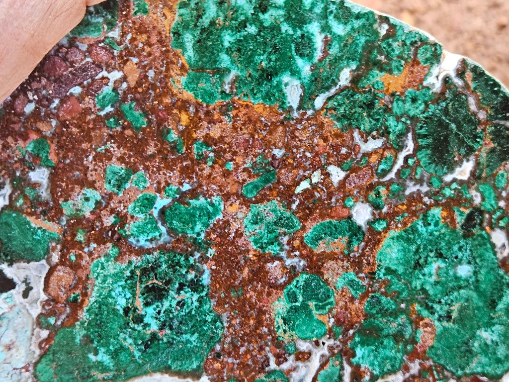 Consisting of dark green malachite, tenorite, cuprite, chrysocolla, native copper and brown iron oxides.