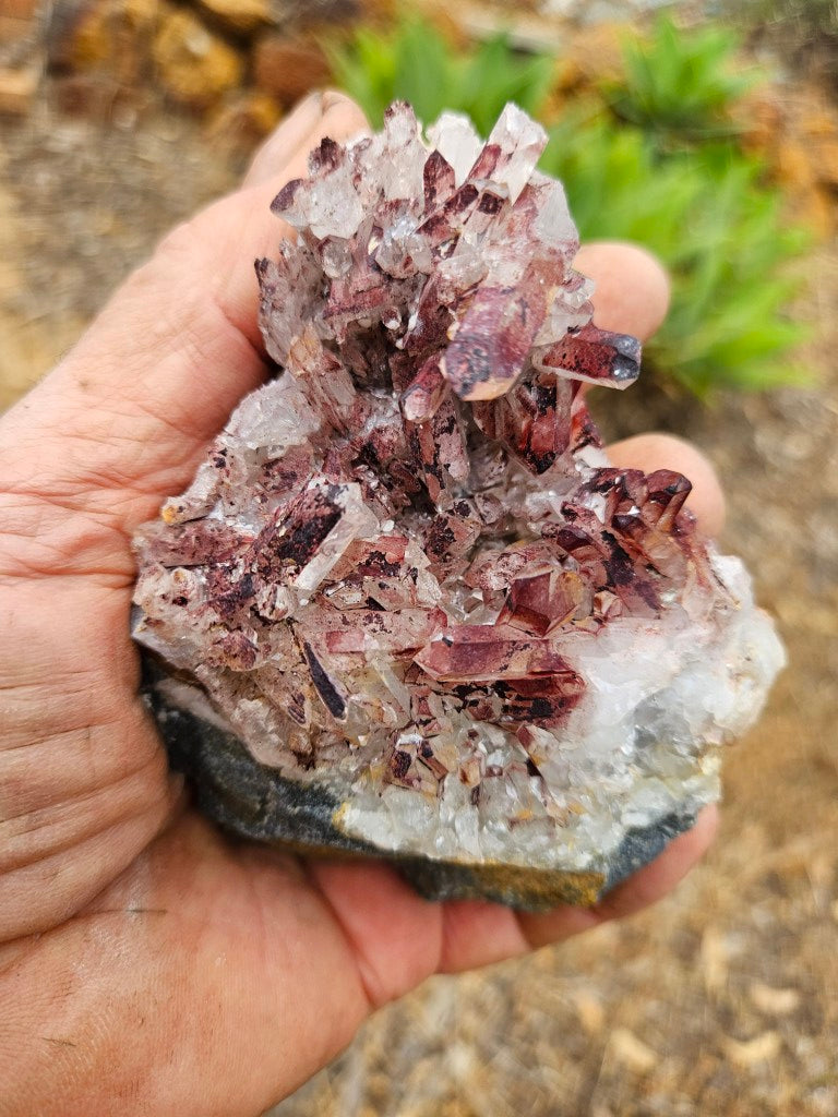These crystal are water clear but have an unusual iron oxide coating that imparts reddish colouration !