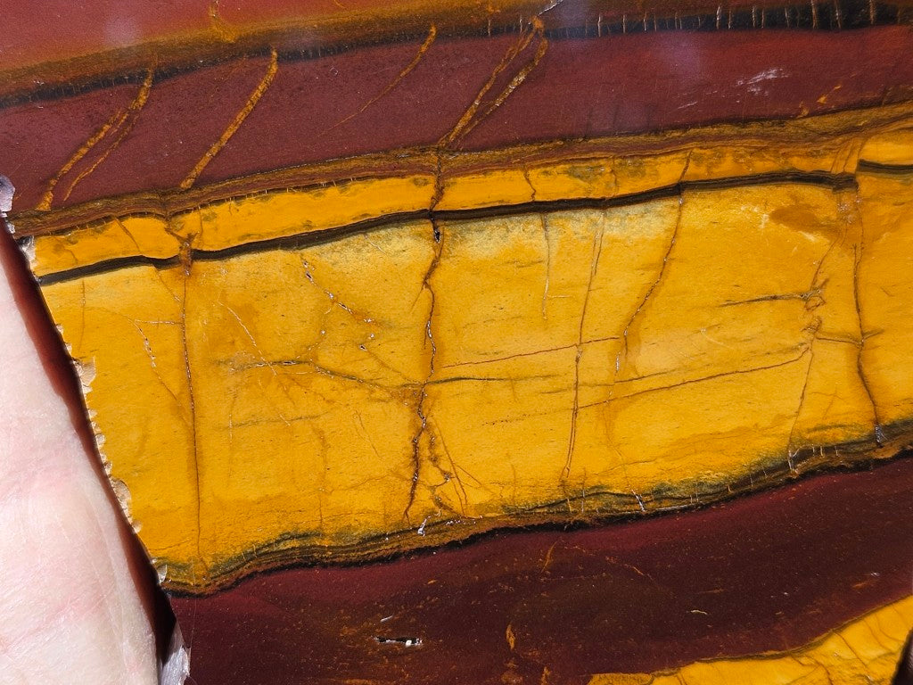 Desert Sunset is a banded iron formation that is comprised of alternating layers of red and yellow jasper and chert with narrow bands of black hematite.