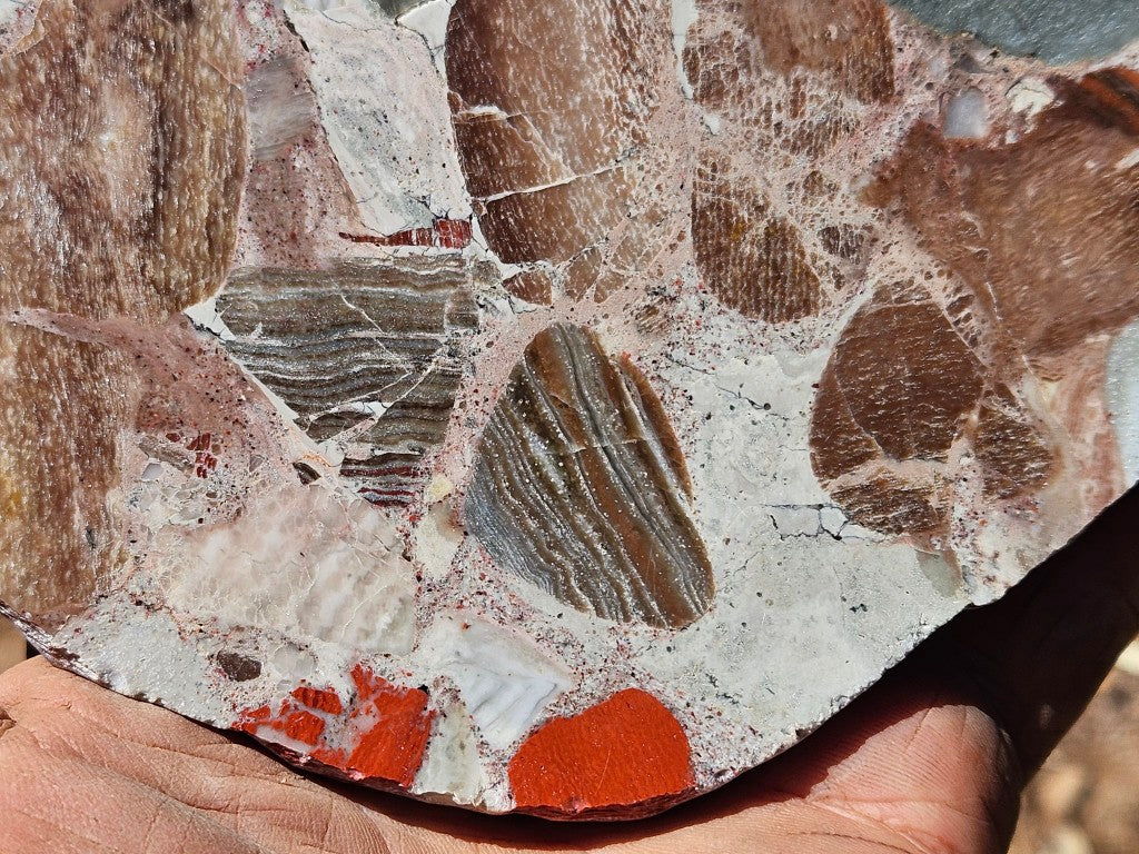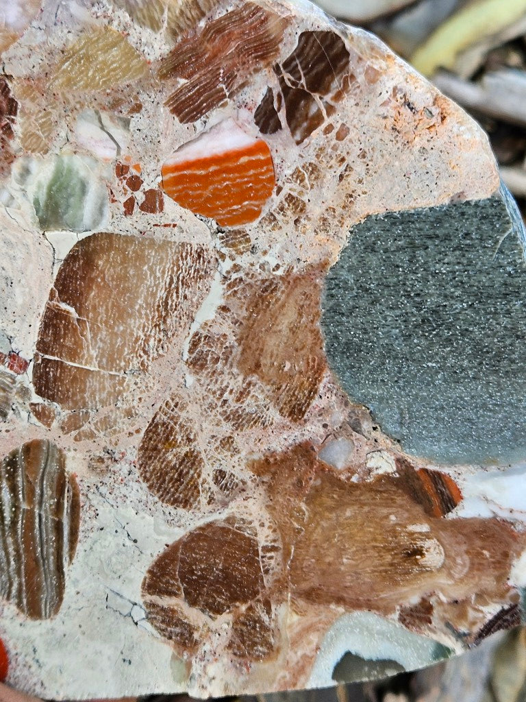 Conglomerate is a sedimentary rock consisting of individual pebbles (clasts) within a finer-grained matrix that have become cemented together. Conglomerates are a very common rock type that occur in numerous locations world wide. The clasts in this example are comprised mainly of banded jaspers, quartz and chert.