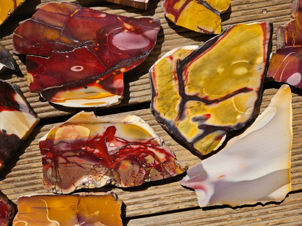 MK561. Bulk assortment of Mookaite slabs, cut and polished on one side.