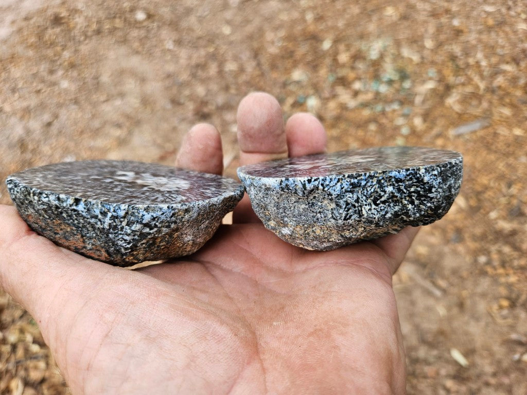 OG217 A matching pair of polished Orbicular Granite halves with natural rough backs. (A single nodule cut in half).