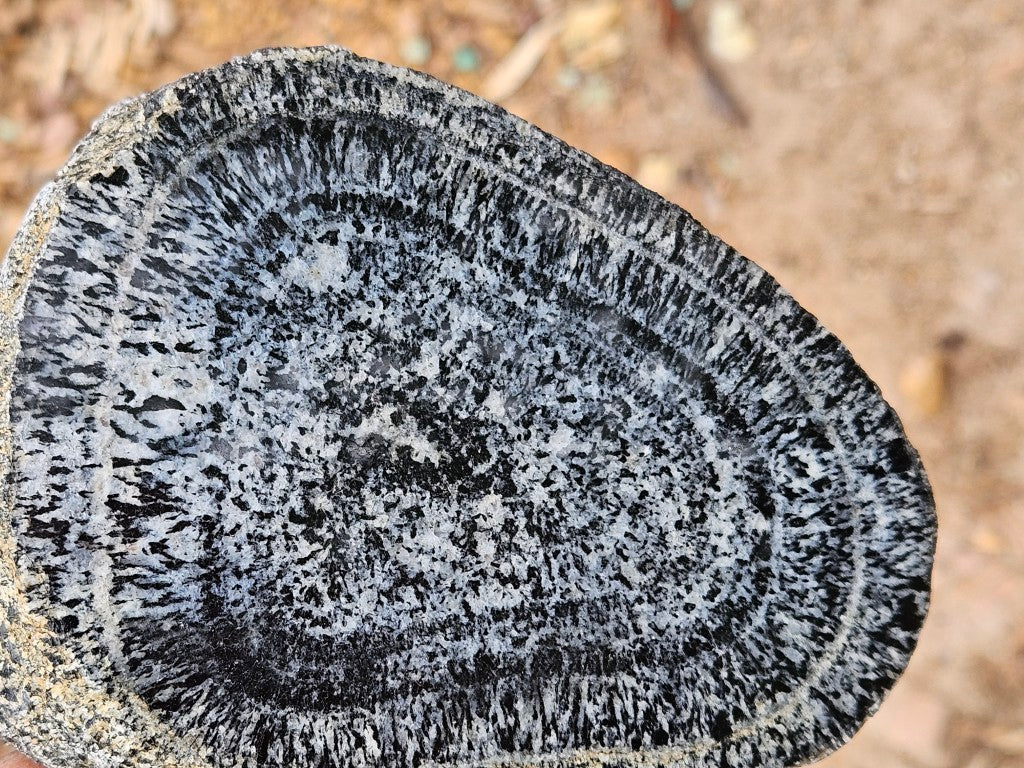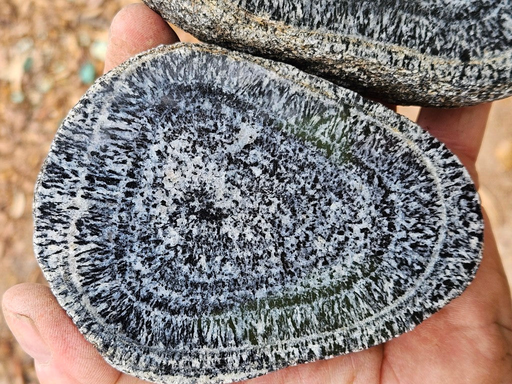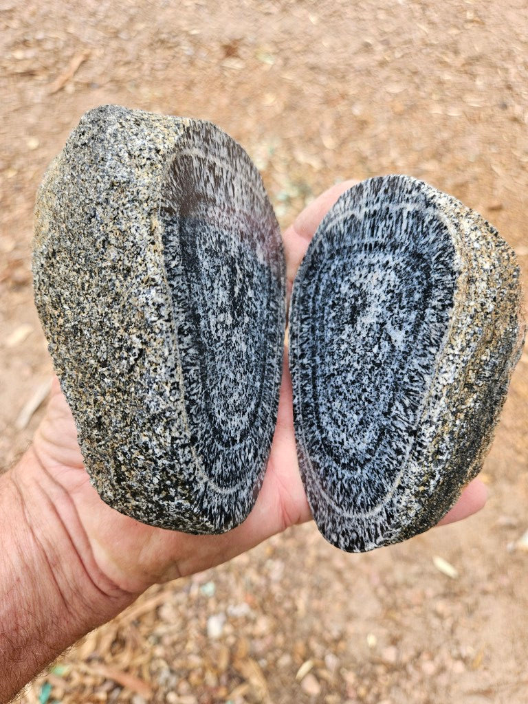 OG218 A matching pair of polished Orbicular Granite halves with natural rough backs. (A single nodule cut in half).