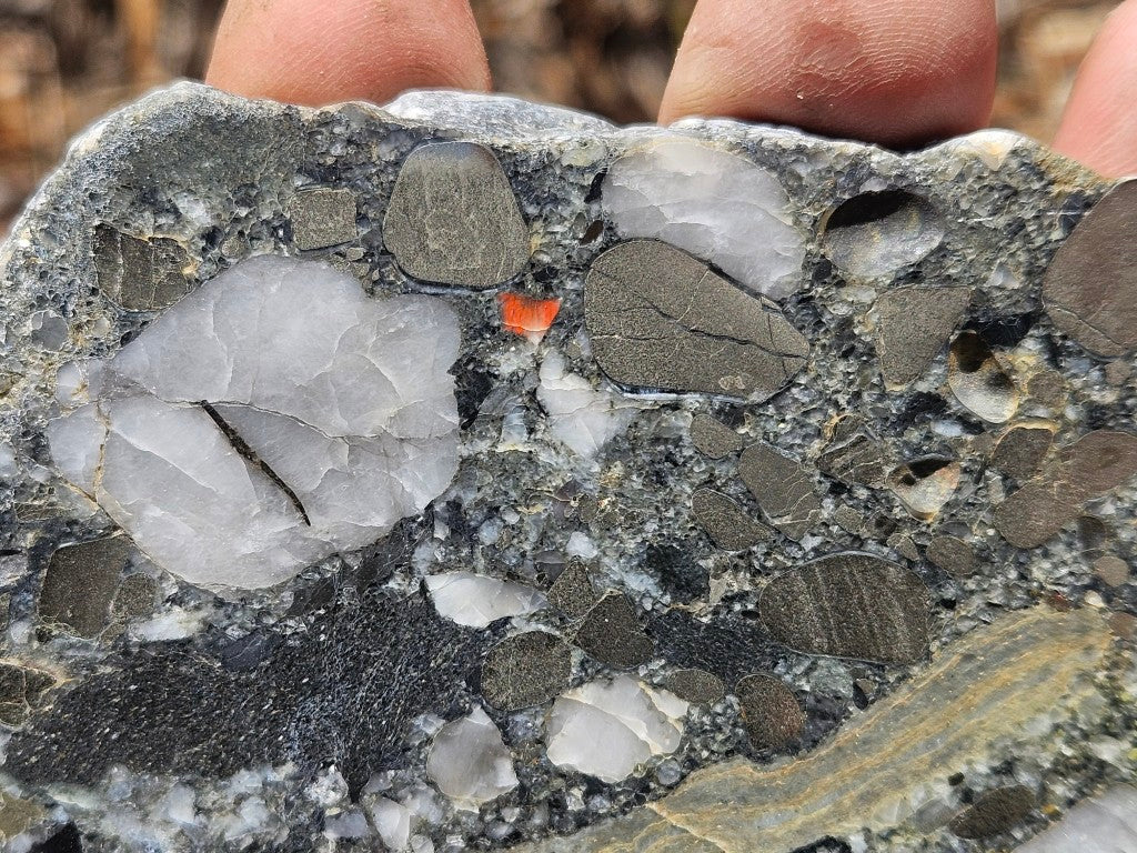 BC110 Beaton's Creek auriferous (gold bearing) conglomerate slab, cut and polished on one side .