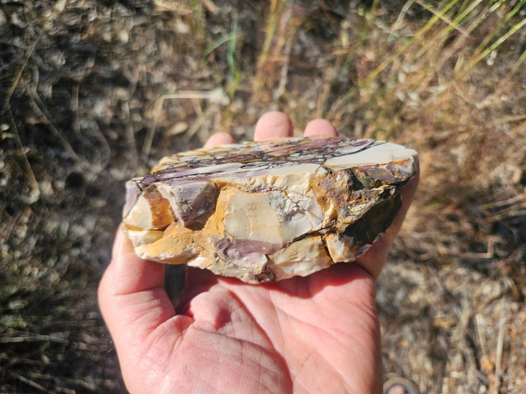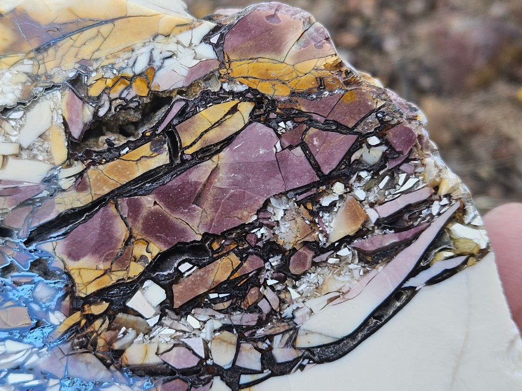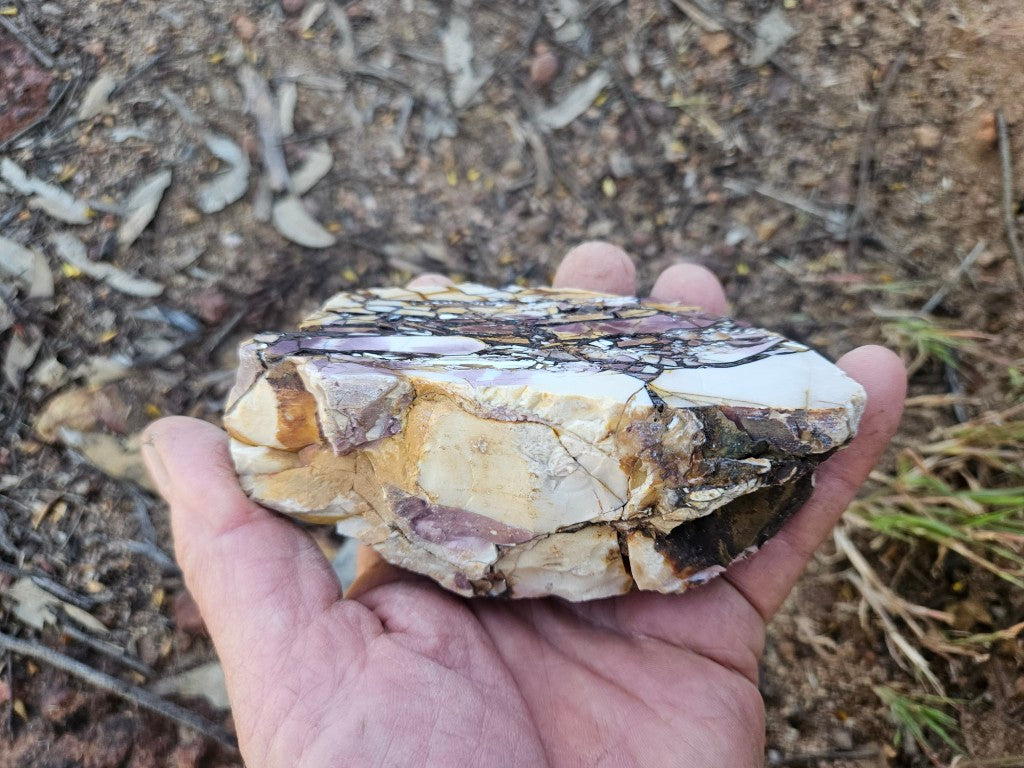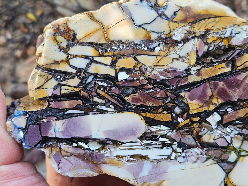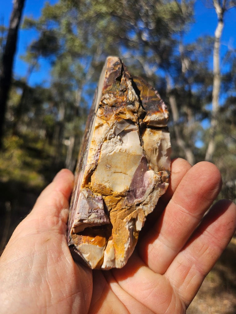 BM340 Brecciated Mookaite rock, cut and polished on one side with a natural rough back .