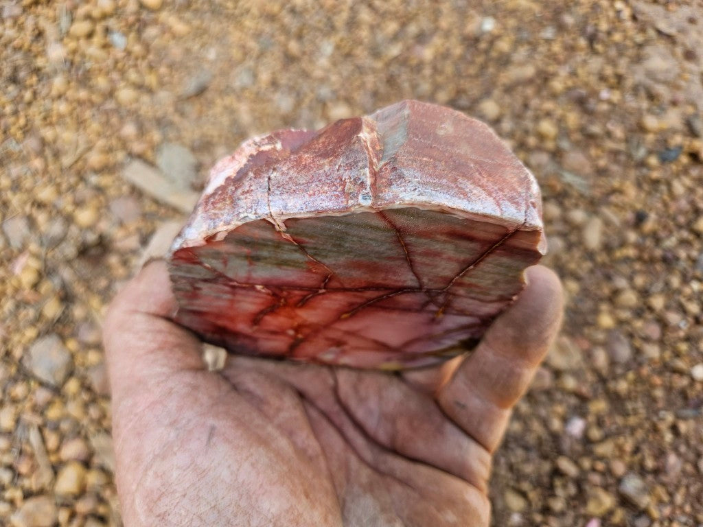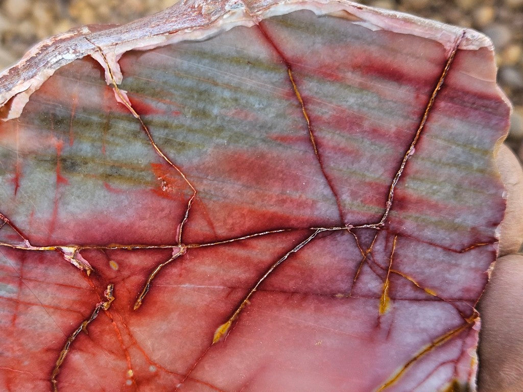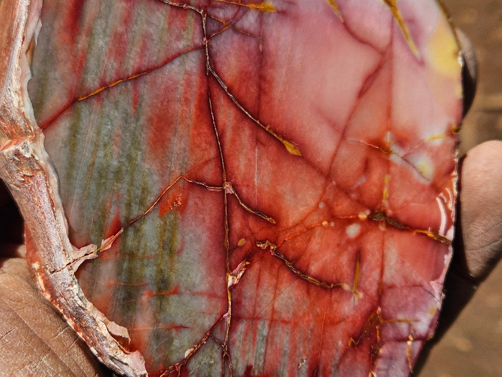 SU194 Sunset Jasper rough rock, cut and polished on one side with a natural rough back.