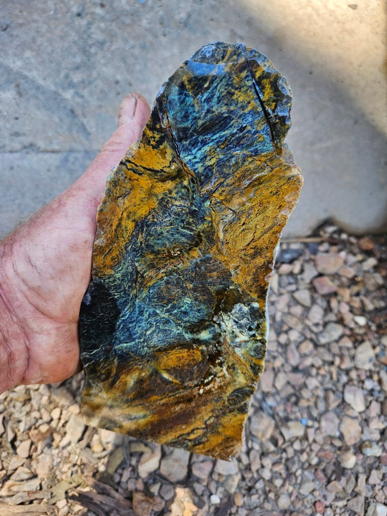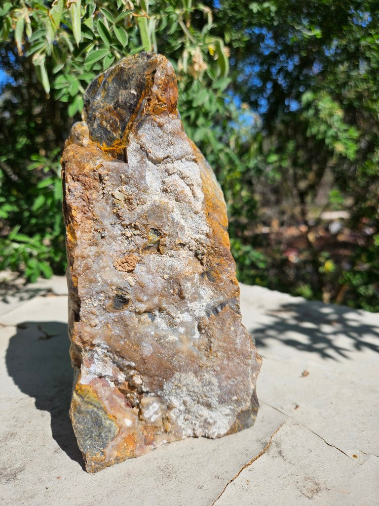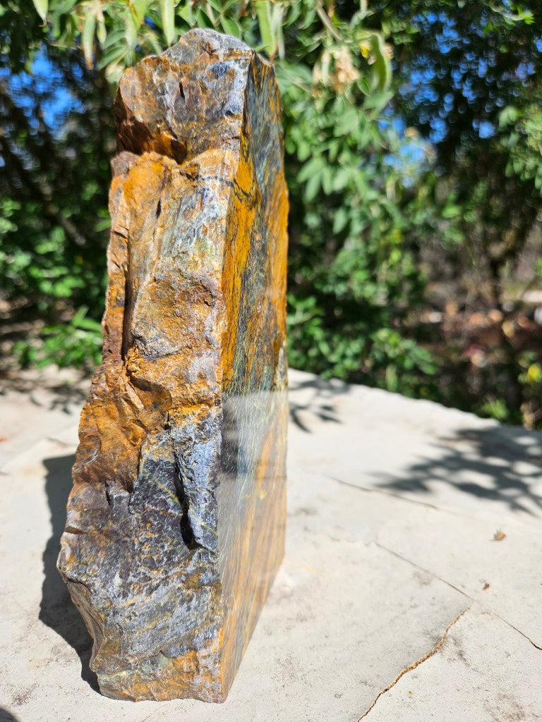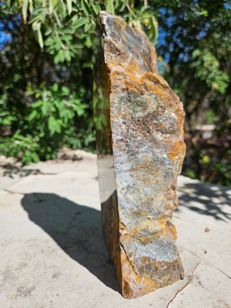 OPS114 Opalised Serpentine rough rock, cut and polished on one side with a natural back and a cut base to stand on.