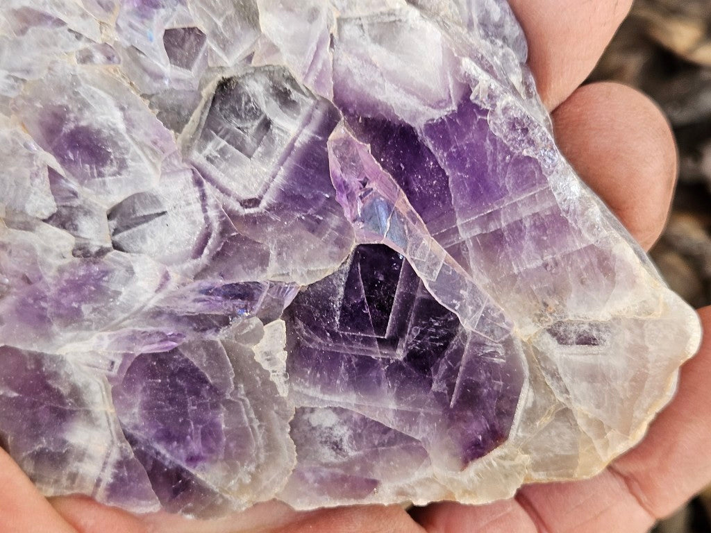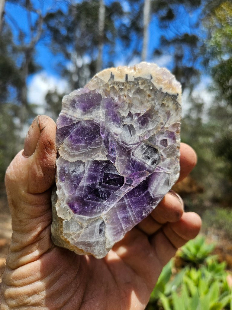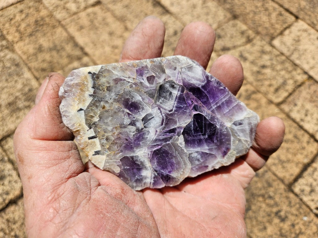 AMP127. Chevron Amethyst. A rough rock, cut and polished on one side with a natural back.