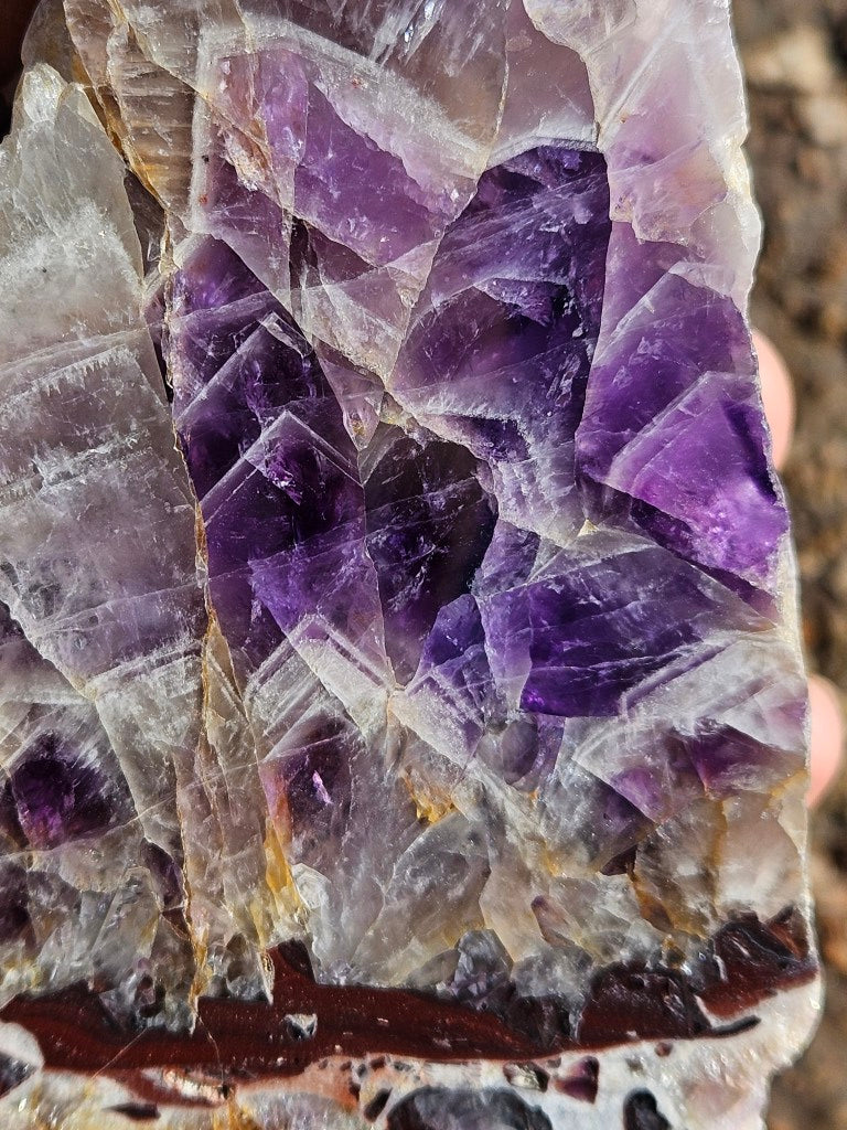 AMP129. Chevron Amethyst. A rough rock, cut and polished on one side with a natural back.
