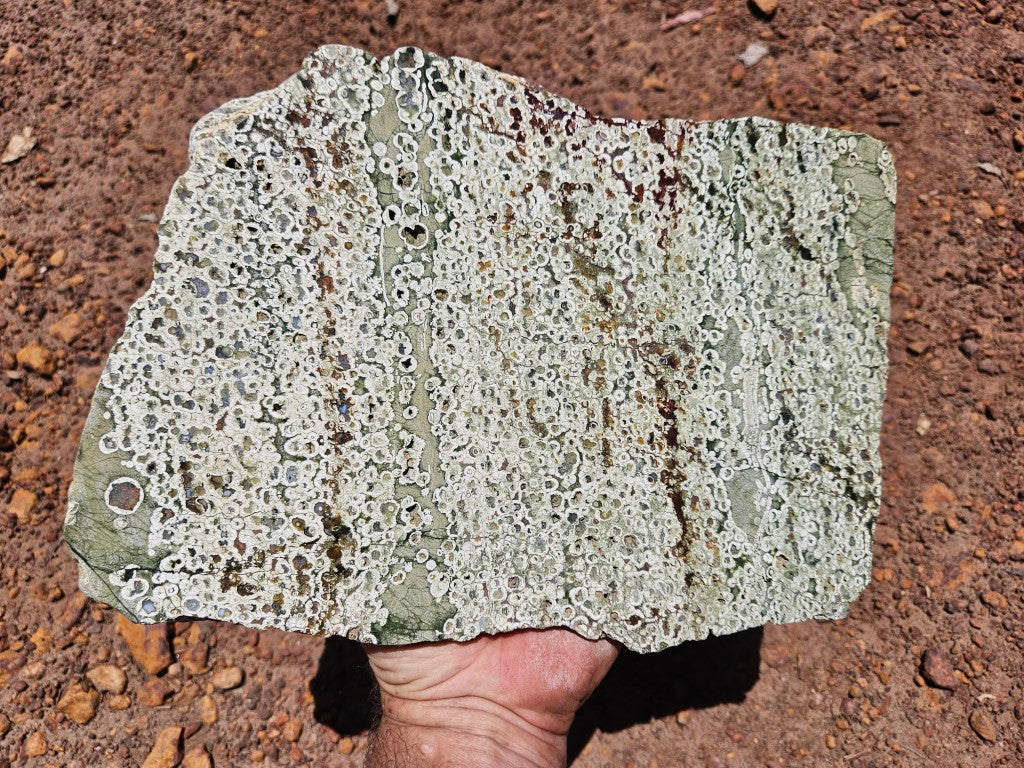 RFJ162. Rain Forest Jasper (Spherulitic rhyolite) slab, polished on one side.