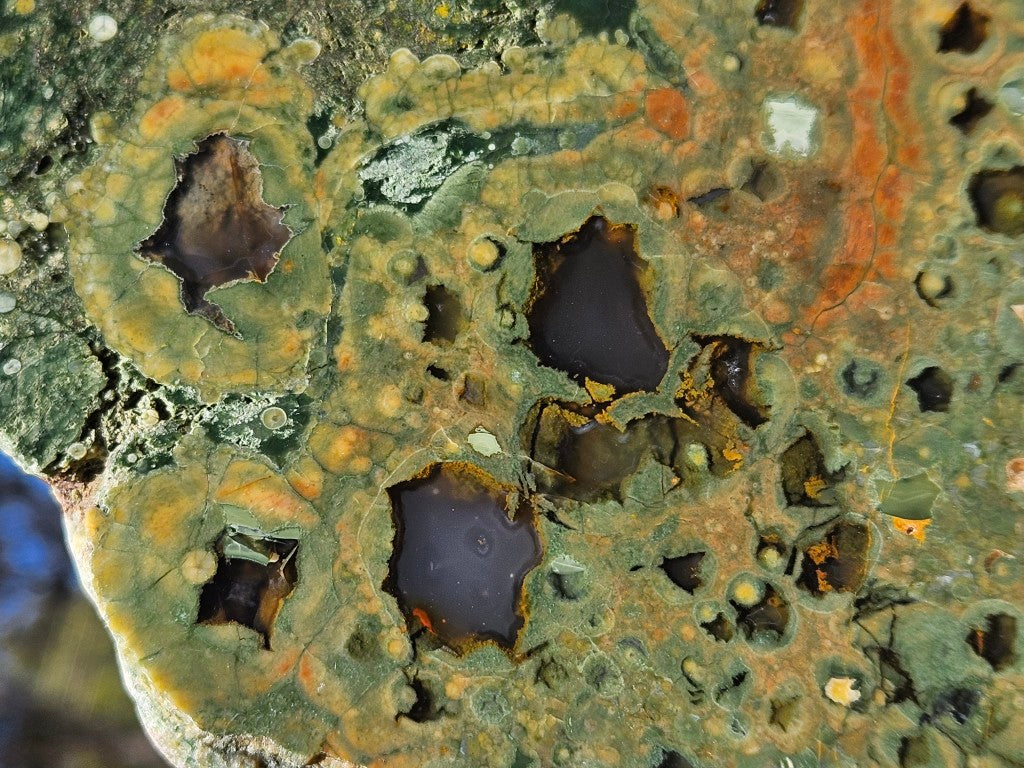 RFJ164. Rain Forest Jasper (Spherulitic rhyolite) slab, polished on one side.
