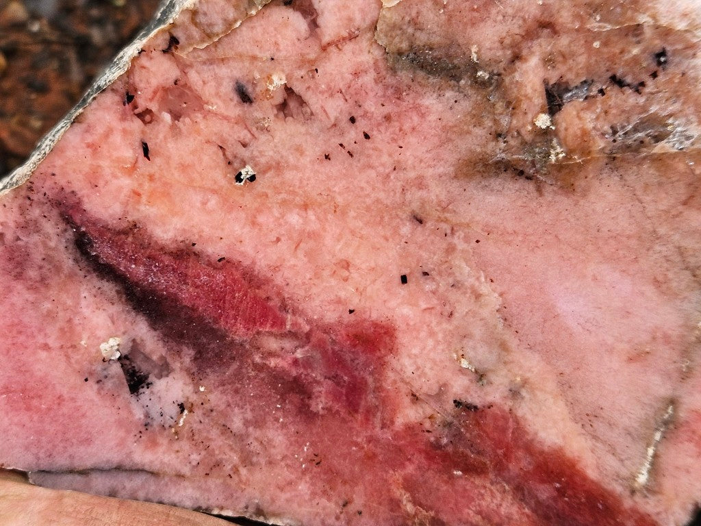 RH295 Rhodonite rock, cut and polished on one side with a natural rough back.