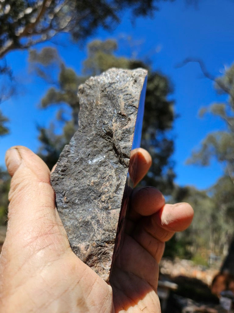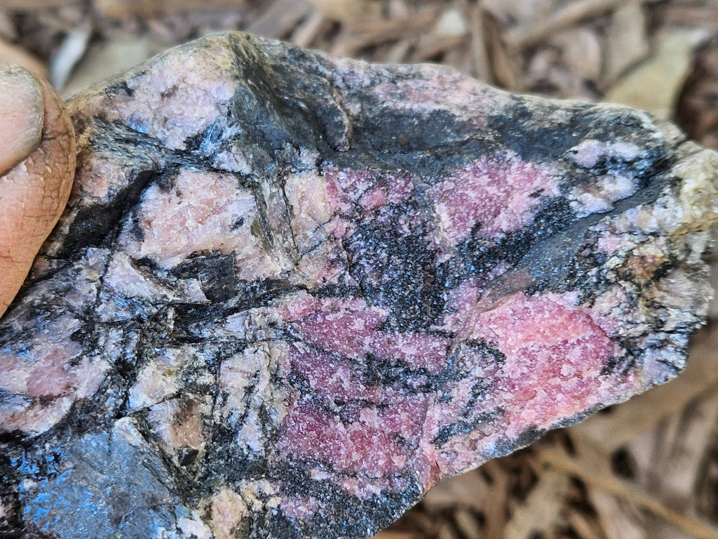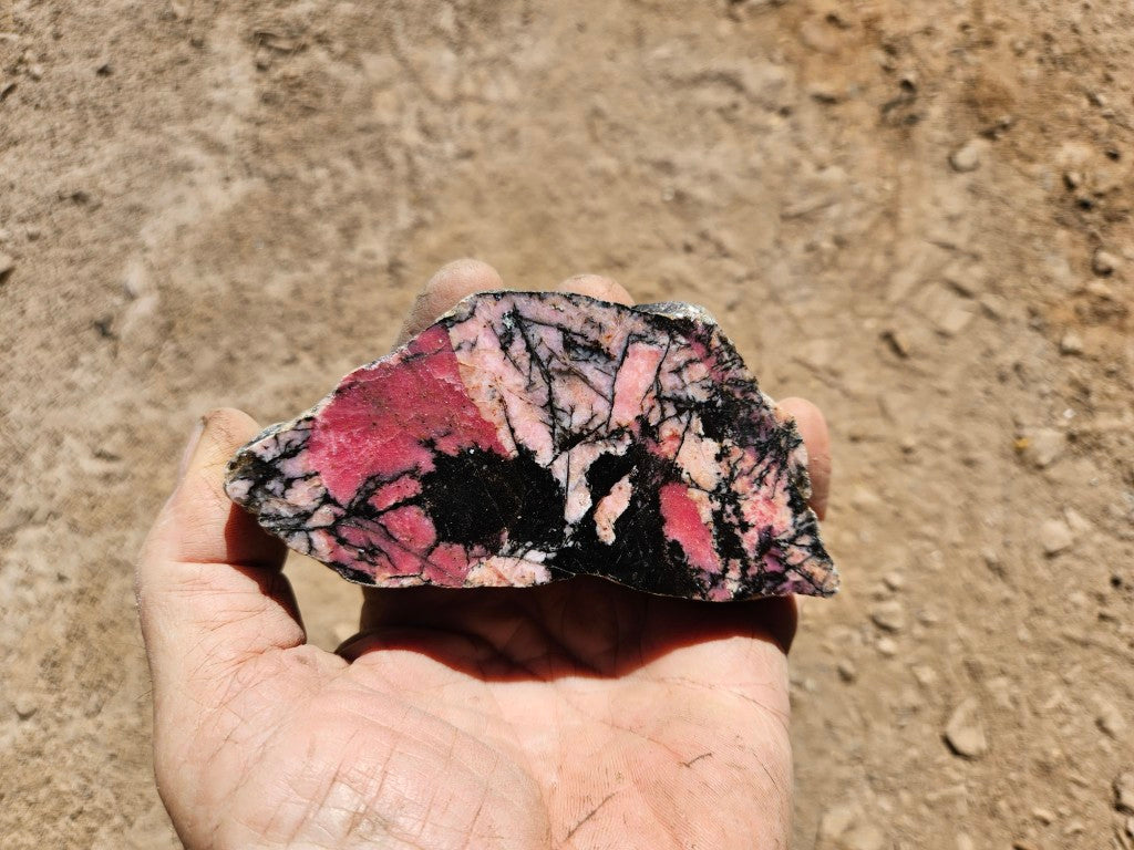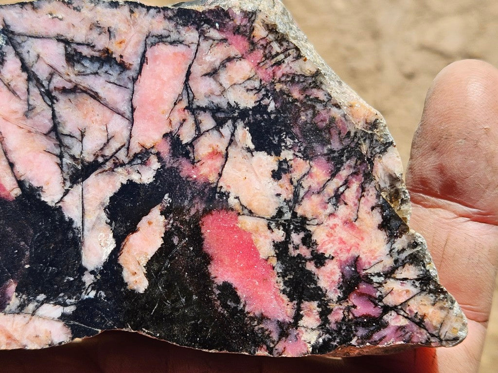 RH304 Rhodonite rock, cut and polished on one side with a natural rough back.