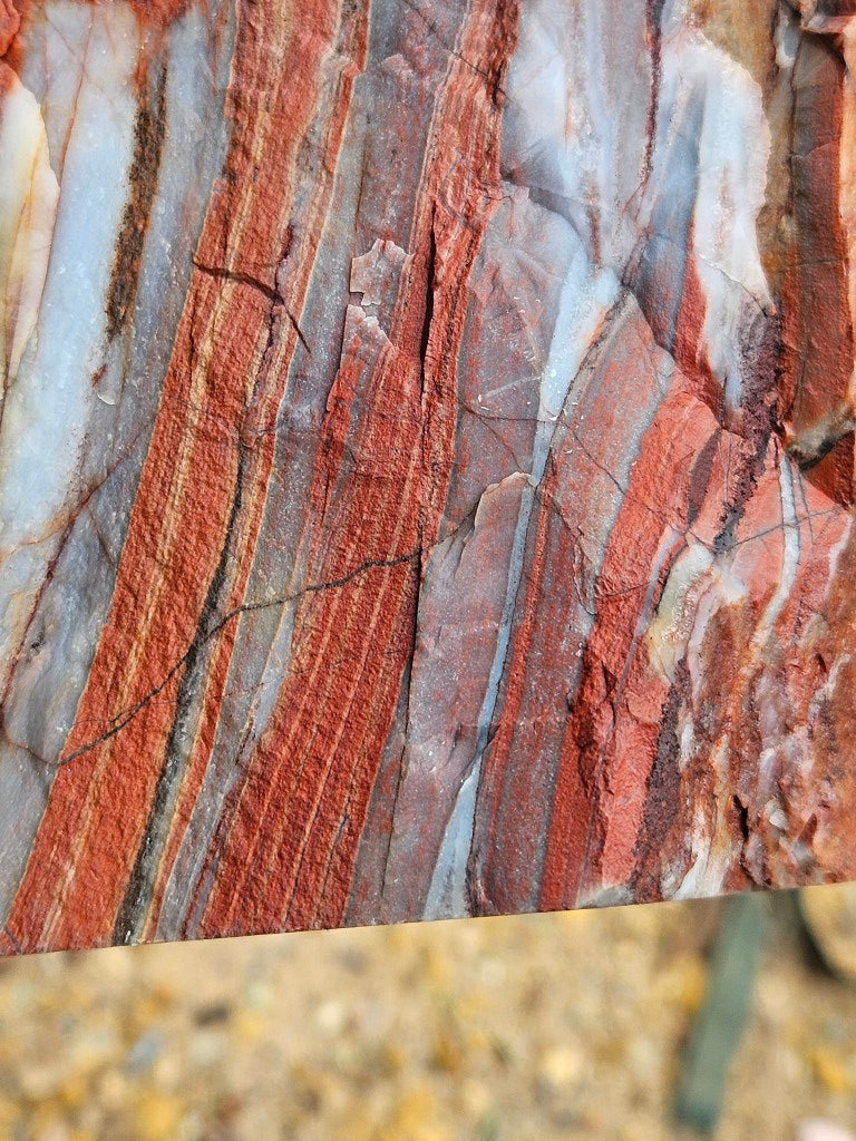Marble Bar chert is a finely banded, iron-rich silica rock from the Marble Bar Chert Member (Warrawoona Group) of Western Australia. Formed in shallow Archean seas, it dates to the Paleoarchean (~3.46 billion years old), making it one of the Earth’s oldest well-preserved sedimentary rocks.