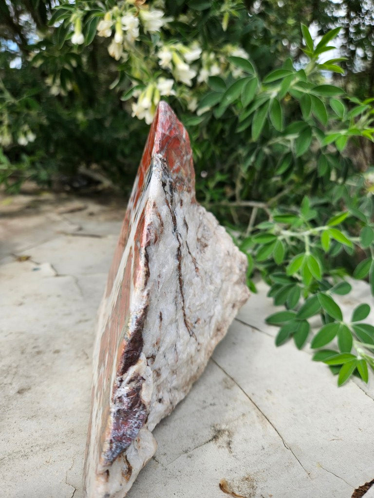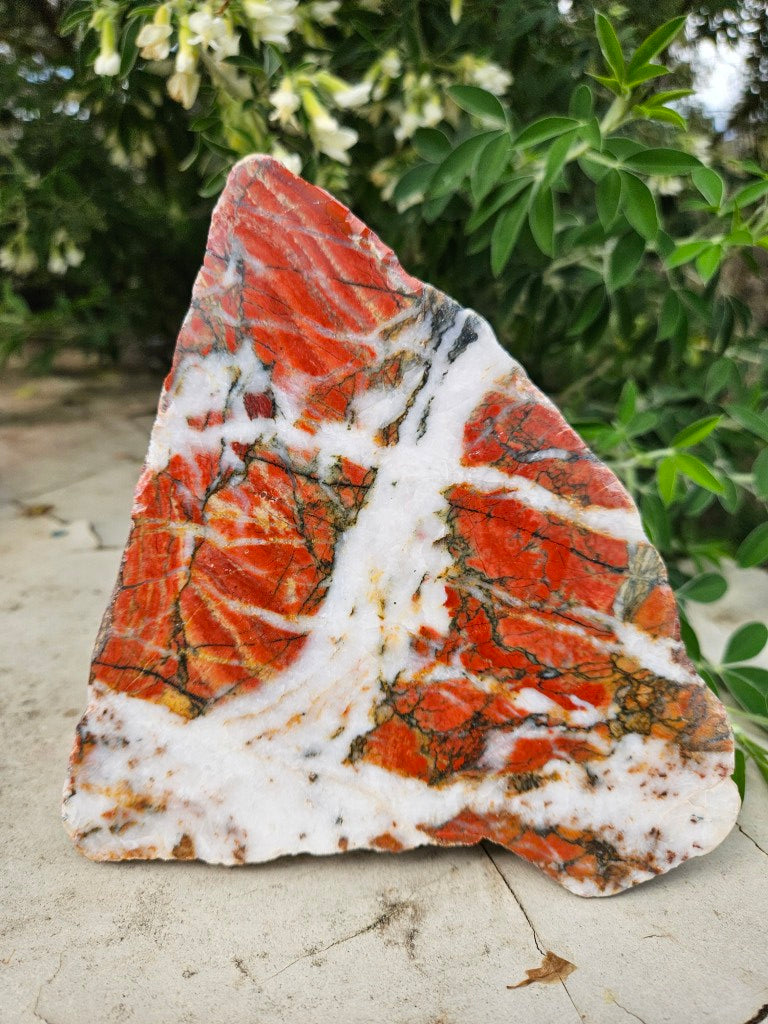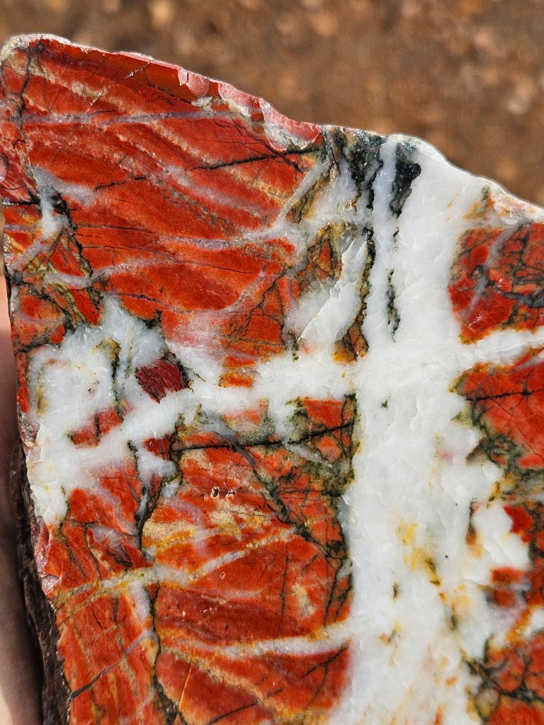 Starry Jasper is a vibrant red jasper with intrusions of quartz veining along with splashes of silvery , metallic looking pyrite. It was collected many years ago from a large open cut gold mine at Reedy's near Cue in Western Australia.