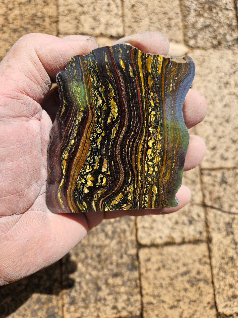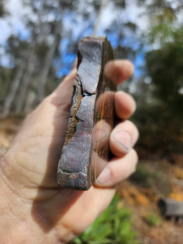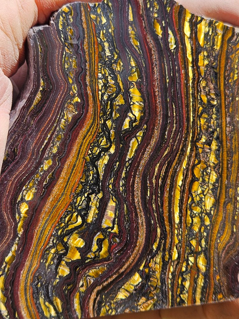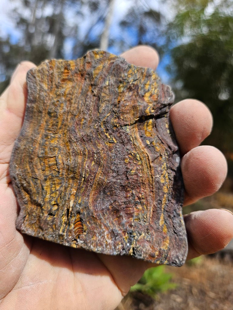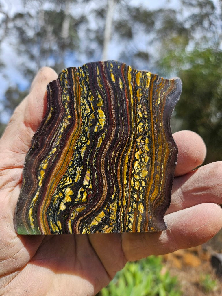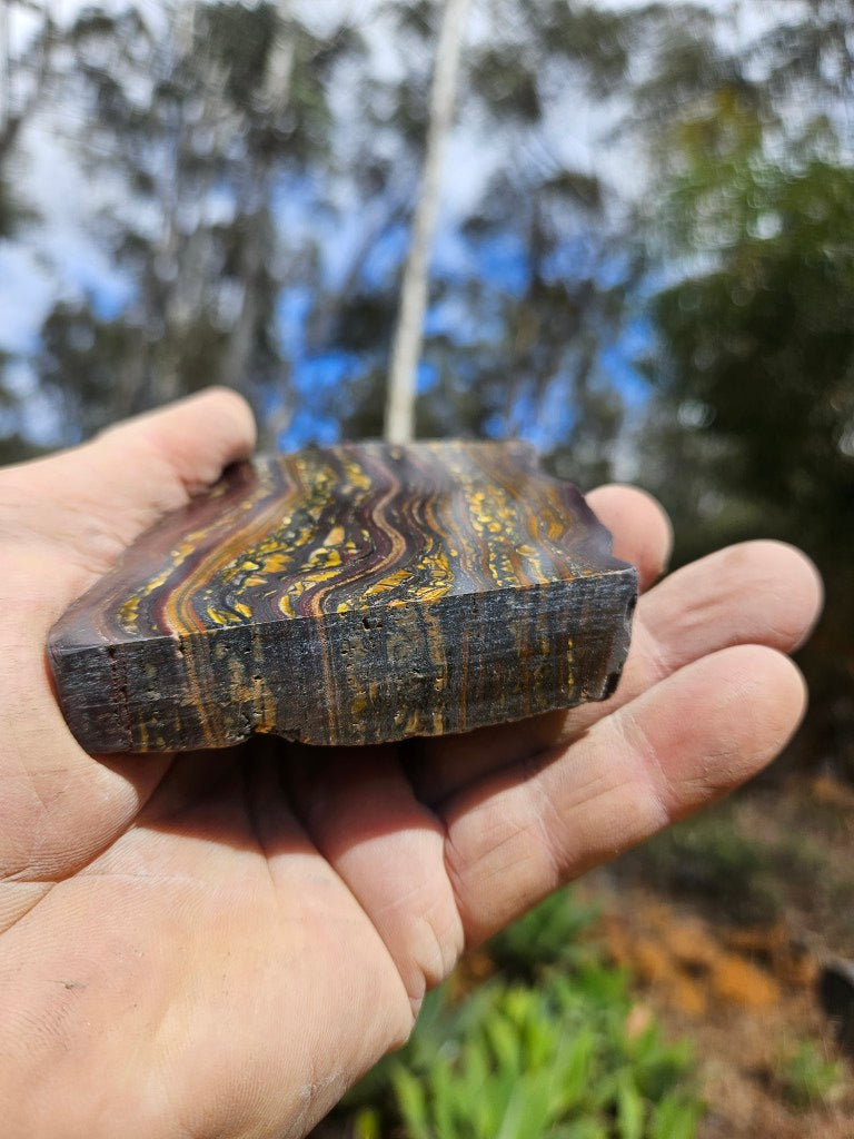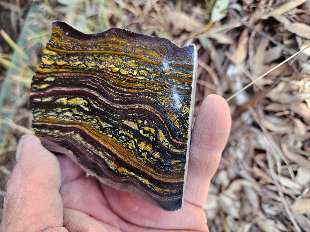 TI393 Tiger Iron rough rock, cut and polished on one side with a rough natural back and a cut base to sit as a display specimen.