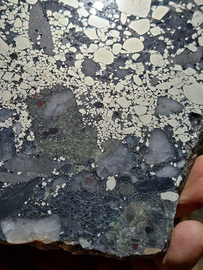 BC108 Beaton's Creek auriferous (gold bearing) conglomerate slab, cut and polished on one side .