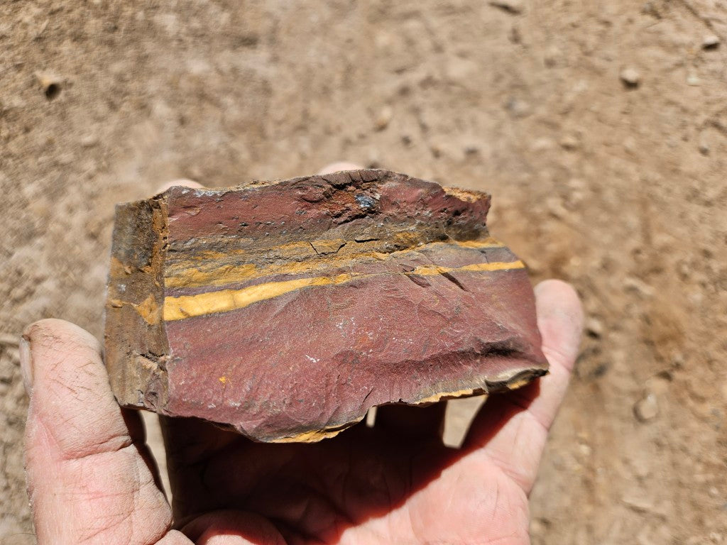 Desert Sunset is a banded iron formation that is comprised of alternating layers of red and yellow jasper and chert with narrow bands of black hematite.