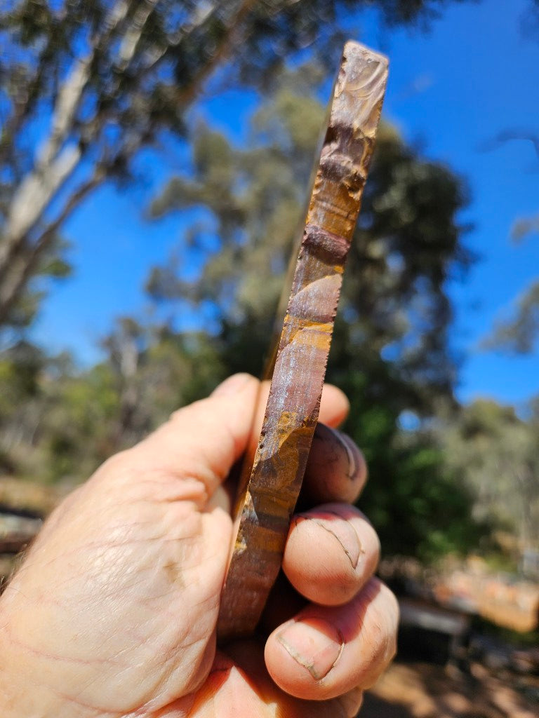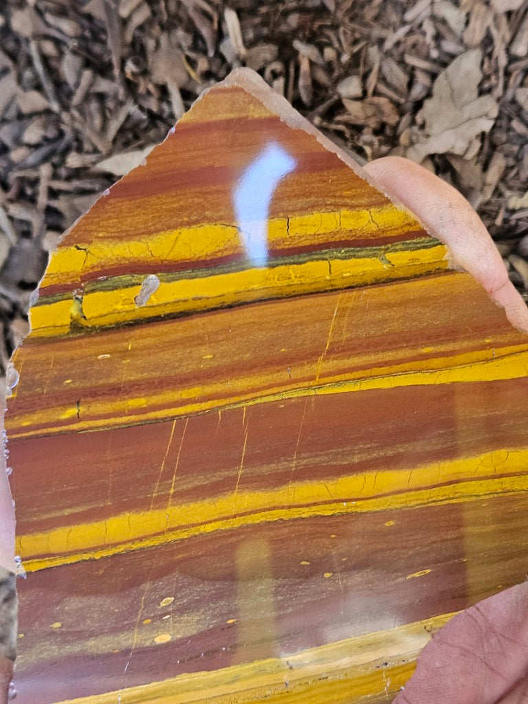 Desert Sunset is a banded iron formation that is comprised of alternating layers of red and yellow jasper and chert with narrow bands of black hematite.